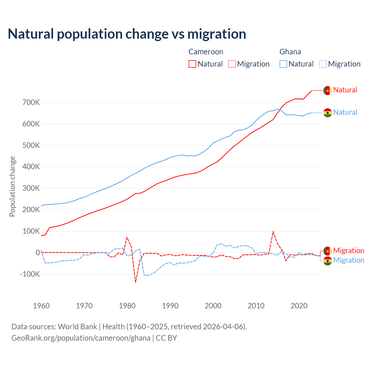 Over the last 10 years, 99.1% of the population change in Cameroon is from natural causes (a gain of 6,982,395 people) and 0.9% is from migration (a gain of 63,139 people). In Ghana 98.6% is from natural causes (a gain of 6,484,449 people) and 1.37% is from migration (a loss of 90,310 people).