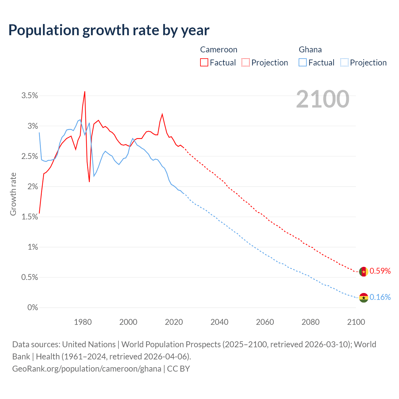 - For the last 10 years, Cameroon has had an average growth rate of +2.84% per year vs +2.1% in Ghana.