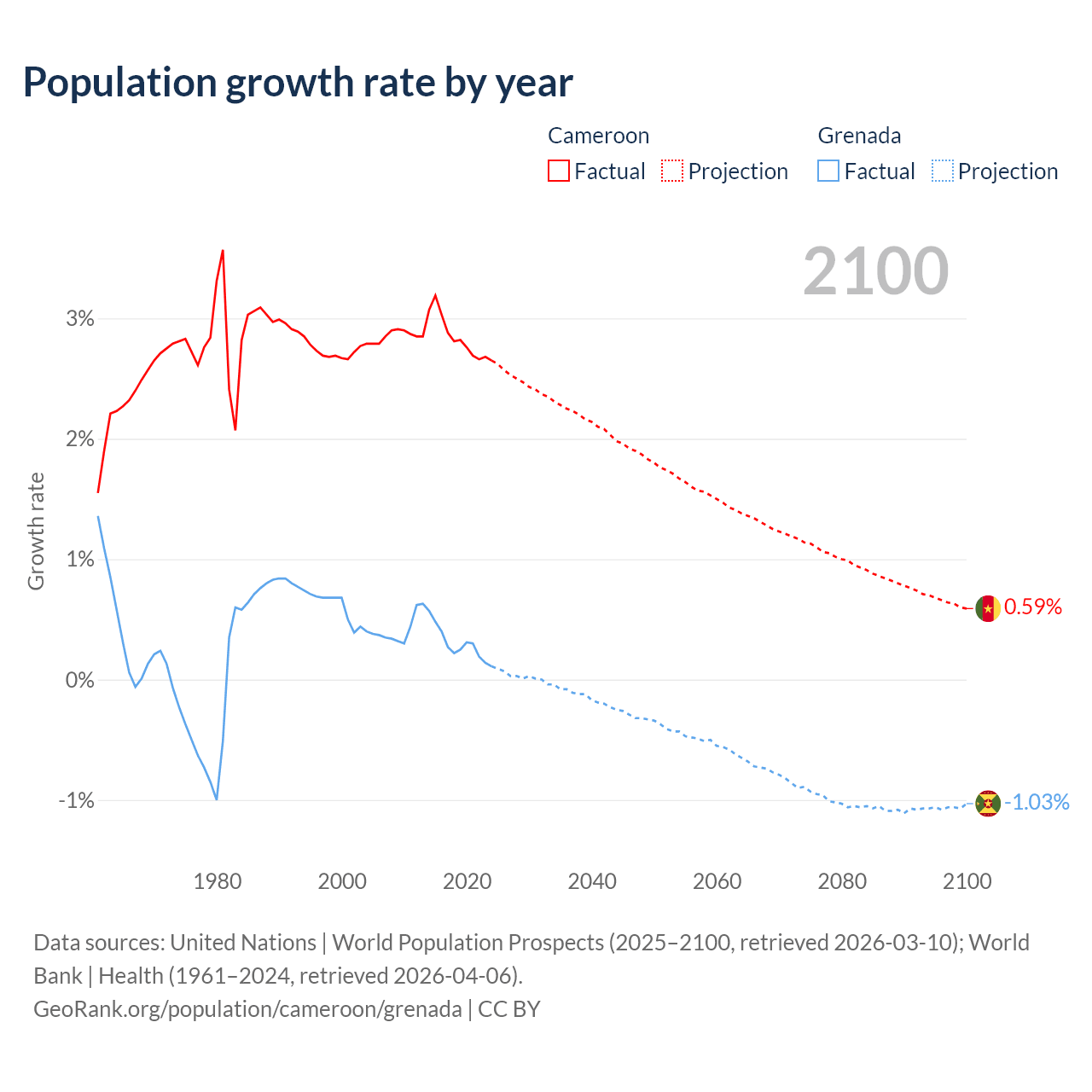 - For the last 10 years, Cameroon has had an average growth rate of +2.84% per year vs +0.29% in Grenada.