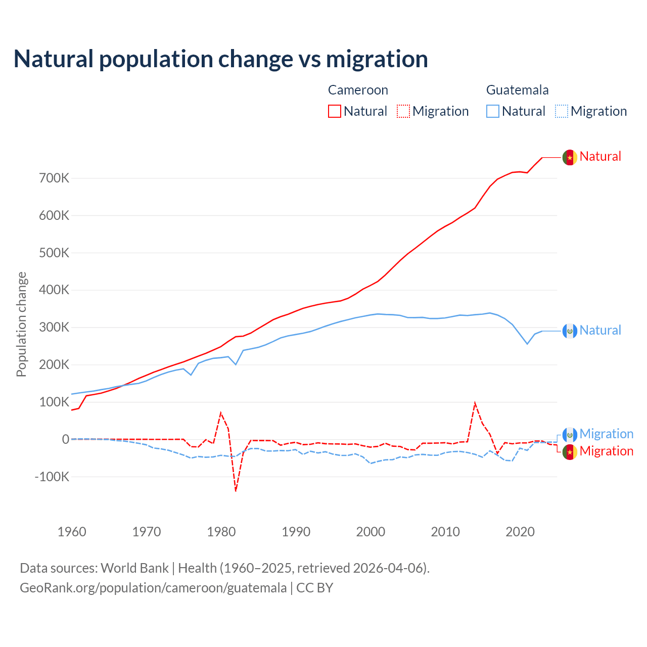 Over the last 10 years, 99.1% of the population change in Cameroon is from natural causes (a gain of 6,982,395 people) and 0.9% is from migration (a gain of 63,139 people). In Guatemala 89.8% is from natural causes (a gain of 3,077,847 people) and 10.2% is from migration (a loss of 347,818 people).