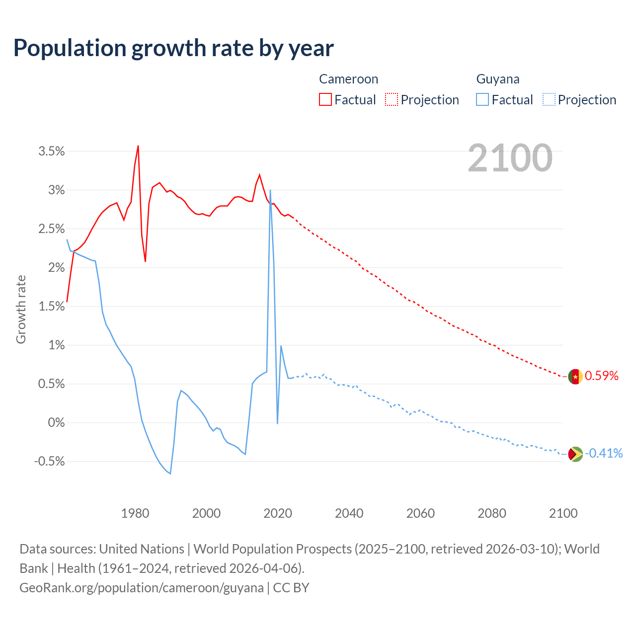 - For the last 10 years, Cameroon has had an average growth rate of +2.84% per year vs +0.94% in Guyana.