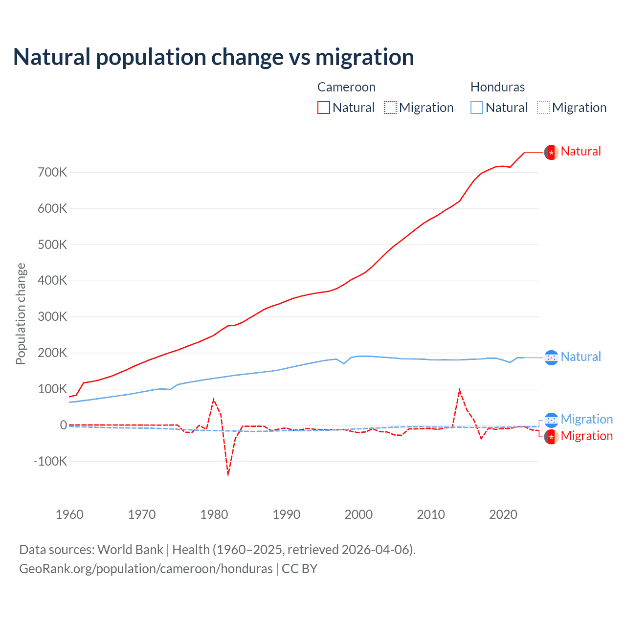 Over the last 10 years, 99.1% of the population change in Cameroon is from natural causes (a gain of 6,982,395 people) and 0.9% is from migration (a gain of 63,139 people). In Honduras 96.7% is from natural causes (a gain of 1,821,125 people) and 3.29% is from migration (a loss of 61,965 people).