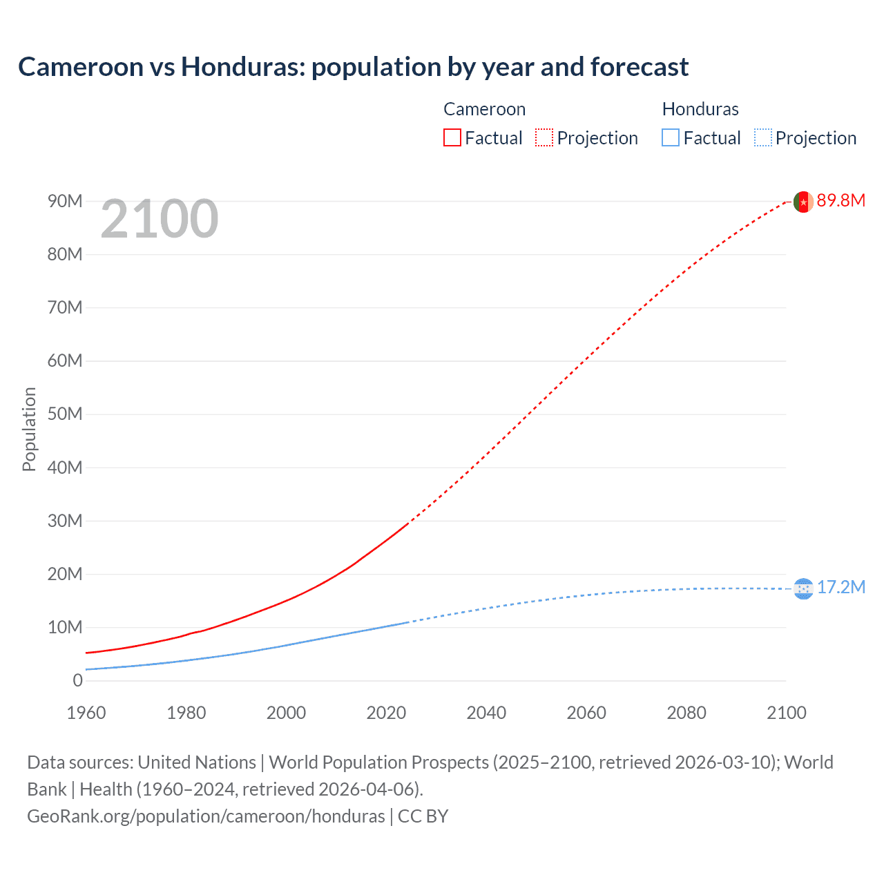 The latest officially reported population of Cameroon was 29,123,744 in 2024 vs 10,825,703 people in Honduras in 2024. In 2026, based on the adjusted UN estimation, the current Cameroon's population is 30,864,115 people compared to 11,237,619 in Honduras.