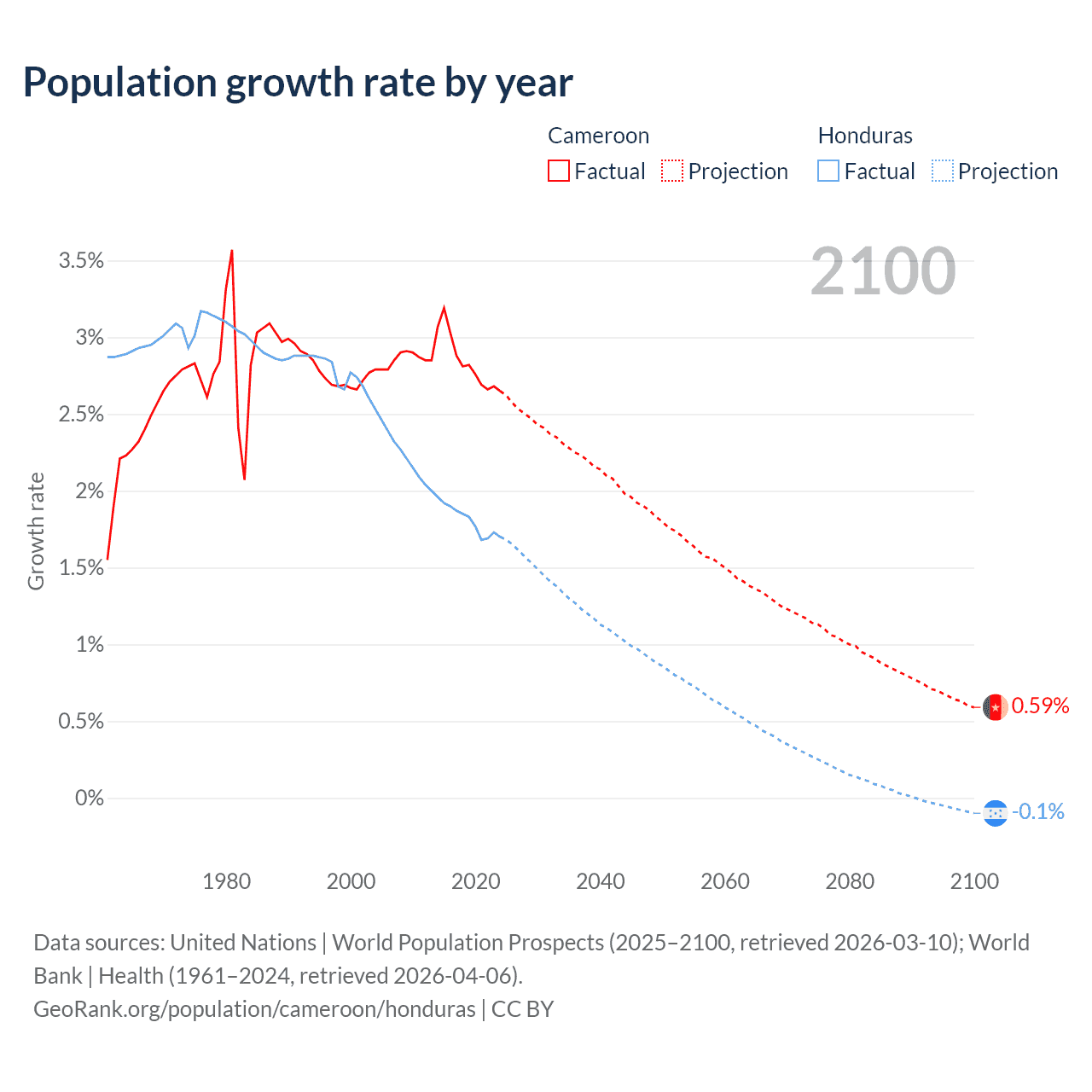 - For the last 10 years, Cameroon has had an average growth rate of +2.84% per year vs +1.81% in Honduras.