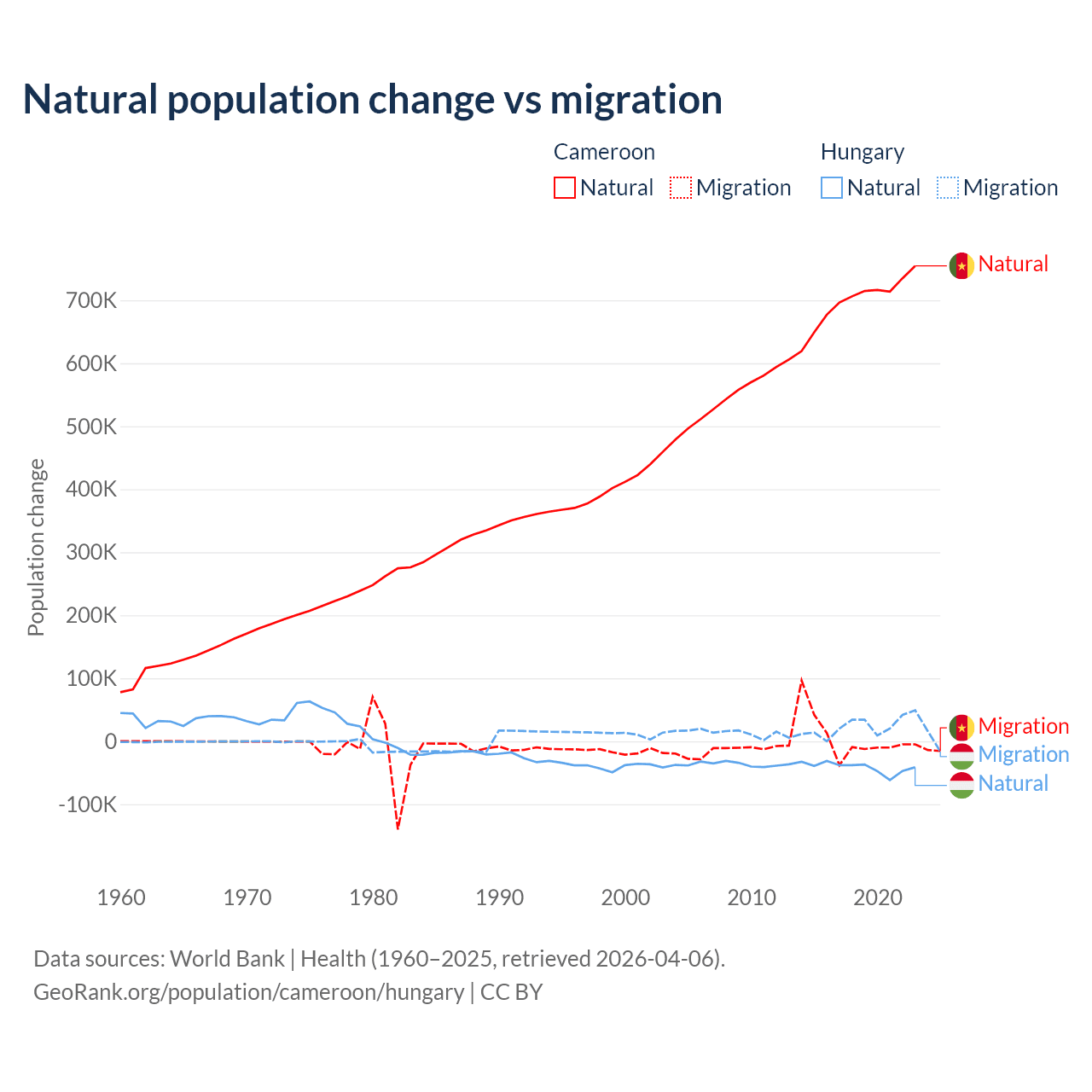Over the last 10 years, 99.1% of the population change in Cameroon is from natural causes (a gain of 6,982,395 people) and 0.9% is from migration (a gain of 63,139 people). In Hungary 63.7% is from natural causes (a loss of 412,838 people) and 36.3% is from migration (a gain of 234,837 people).