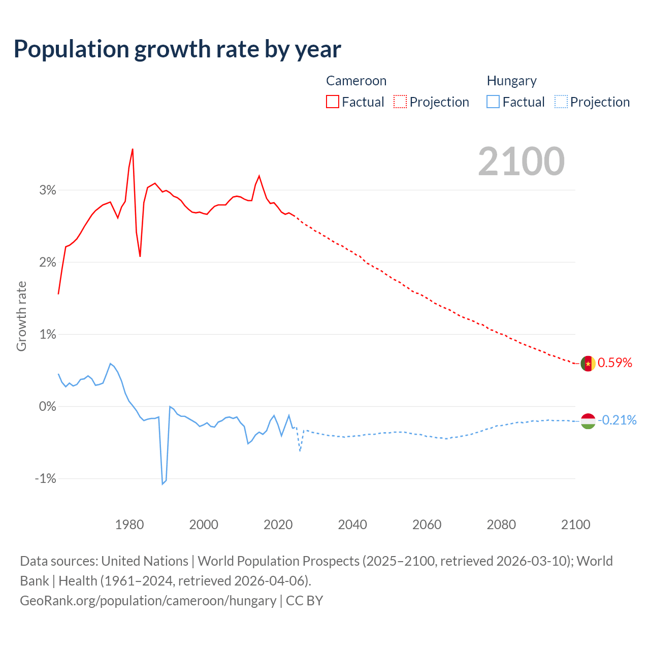 - For the last 10 years, Cameroon has had an average growth rate of +2.84% per year vs -0.29% in Hungary.