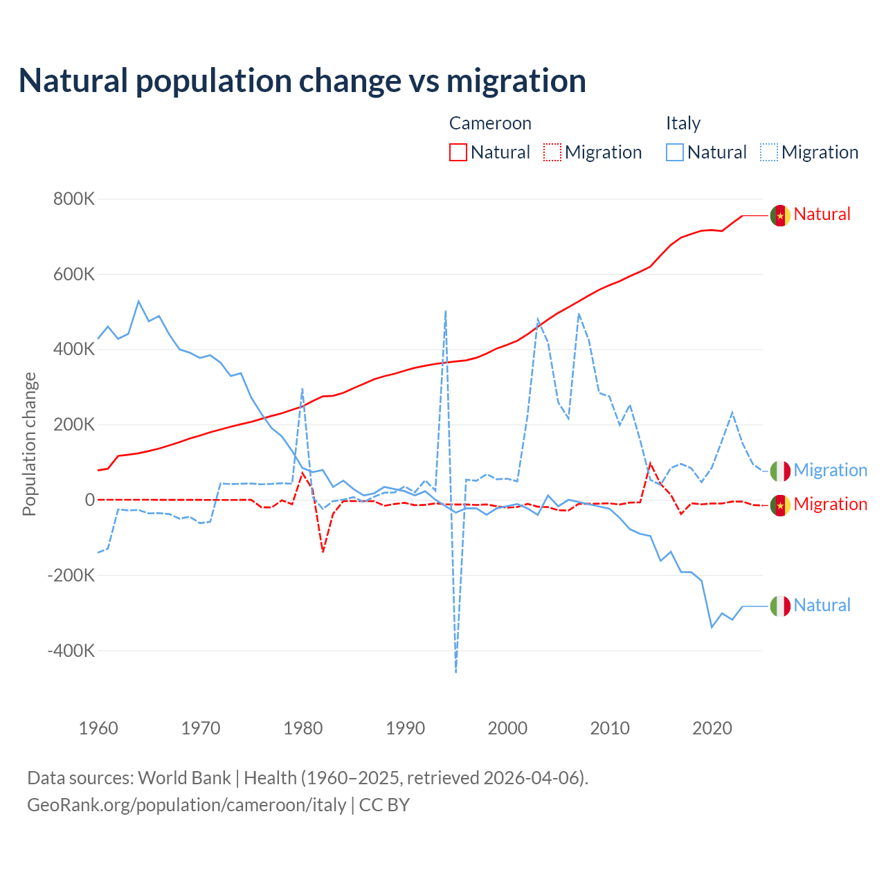 Over the last 10 years, 99.1% of the population change in Cameroon is from natural causes (a gain of 6,982,395 people) and 0.9% is from migration (a gain of 63,139 people). In Italy 68.6% is from natural causes (a loss of 2,239,084 people) and 31.4% is from migration (a gain of 1,026,128 people).