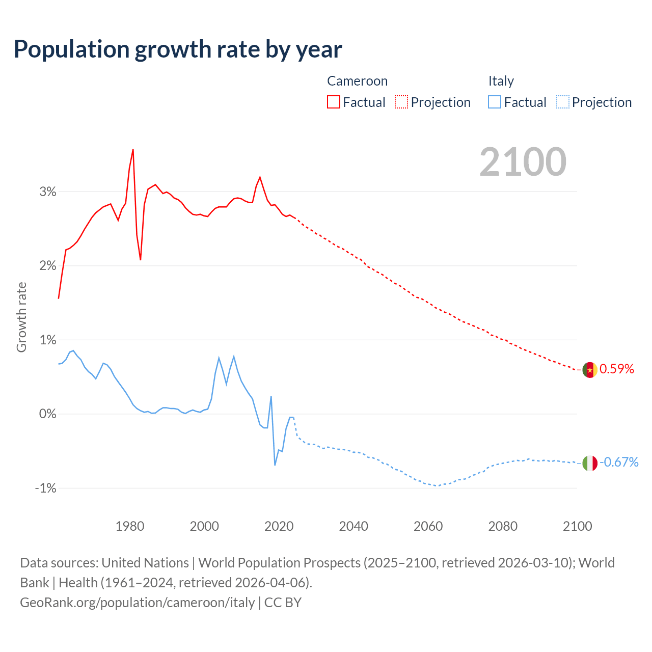 - For the last 10 years, Cameroon has had an average growth rate of +2.84% per year vs -0.21% in Italy.
