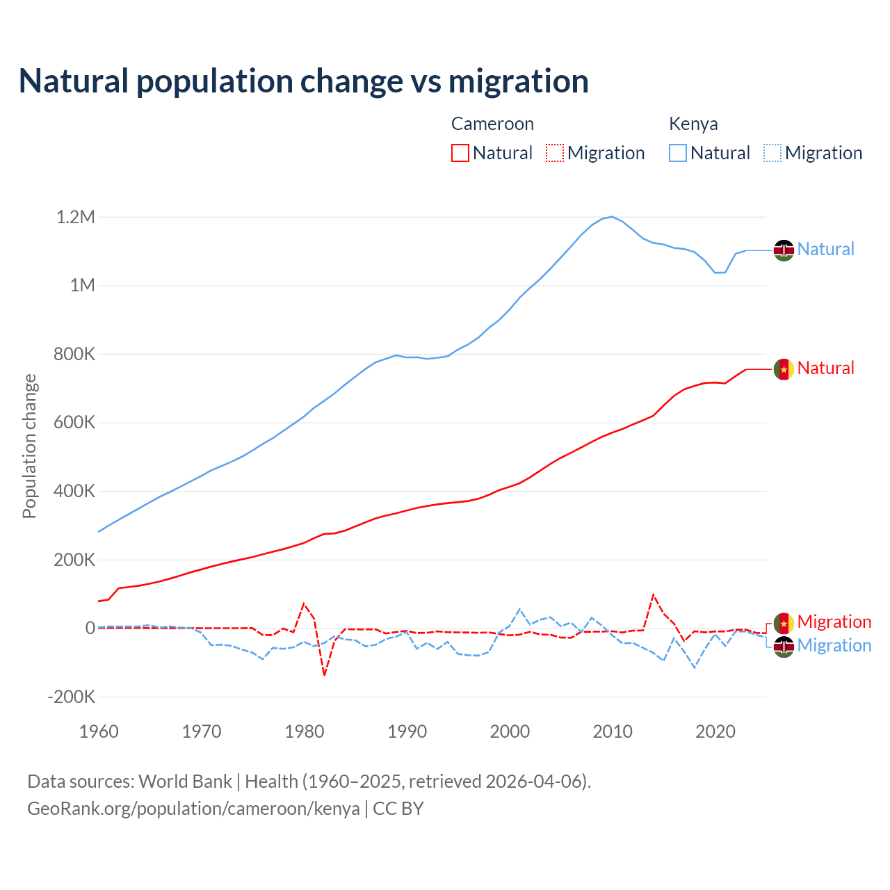 Over the last 10 years, 99.1% of the population change in Cameroon is from natural causes (a gain of 6,982,395 people) and 0.9% is from migration (a gain of 63,139 people). In Kenya 95.3% is from natural causes (a gain of 10,892,362 people) and 4.67% is from migration (a loss of 533,876 people).