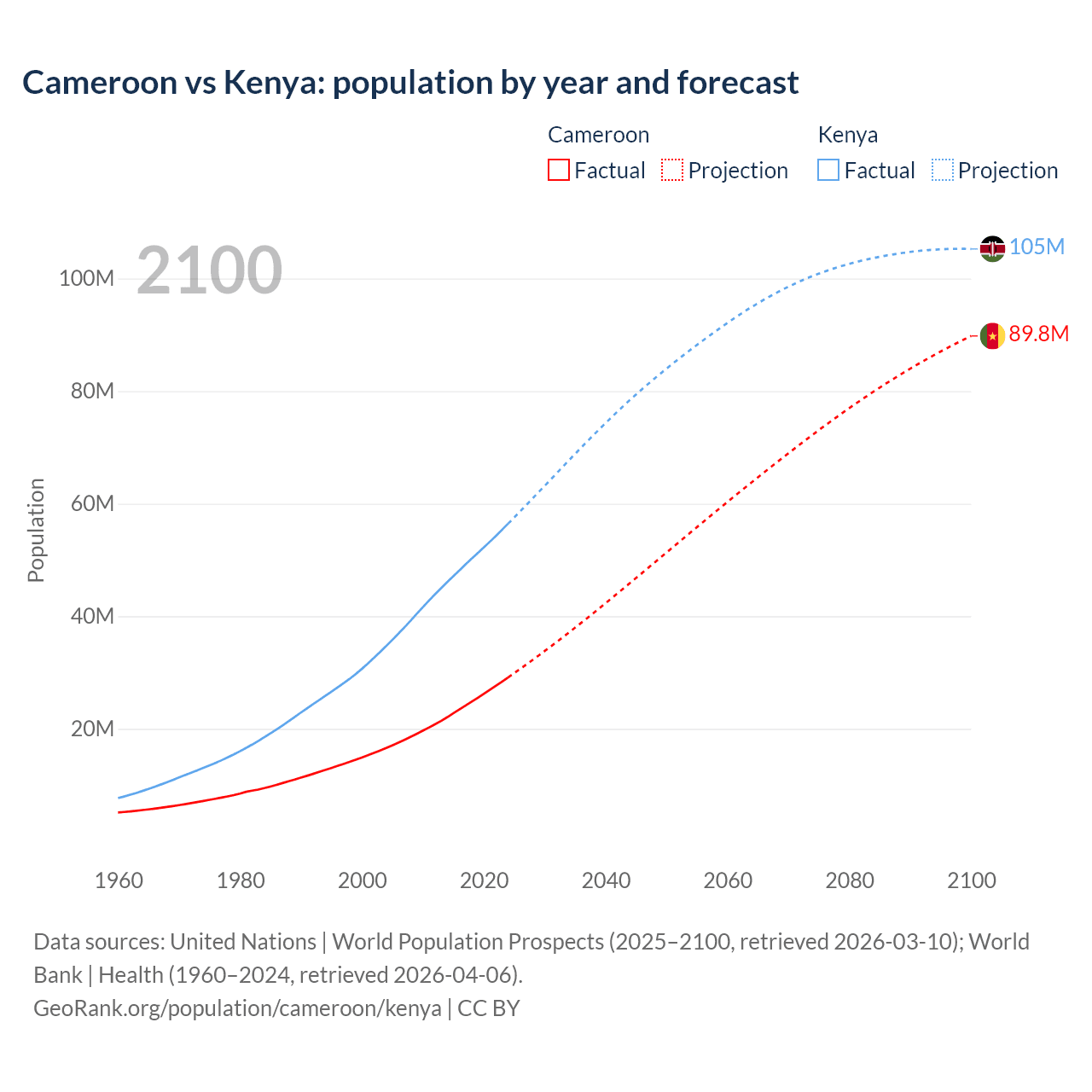 The latest officially reported population of Cameroon was 29,123,744 in 2024 vs 56,432,944 people in Kenya in 2024. In 2026, based on the adjusted UN estimation, the current Cameroon's population is 30,864,115 people compared to 58,955,623 in Kenya.