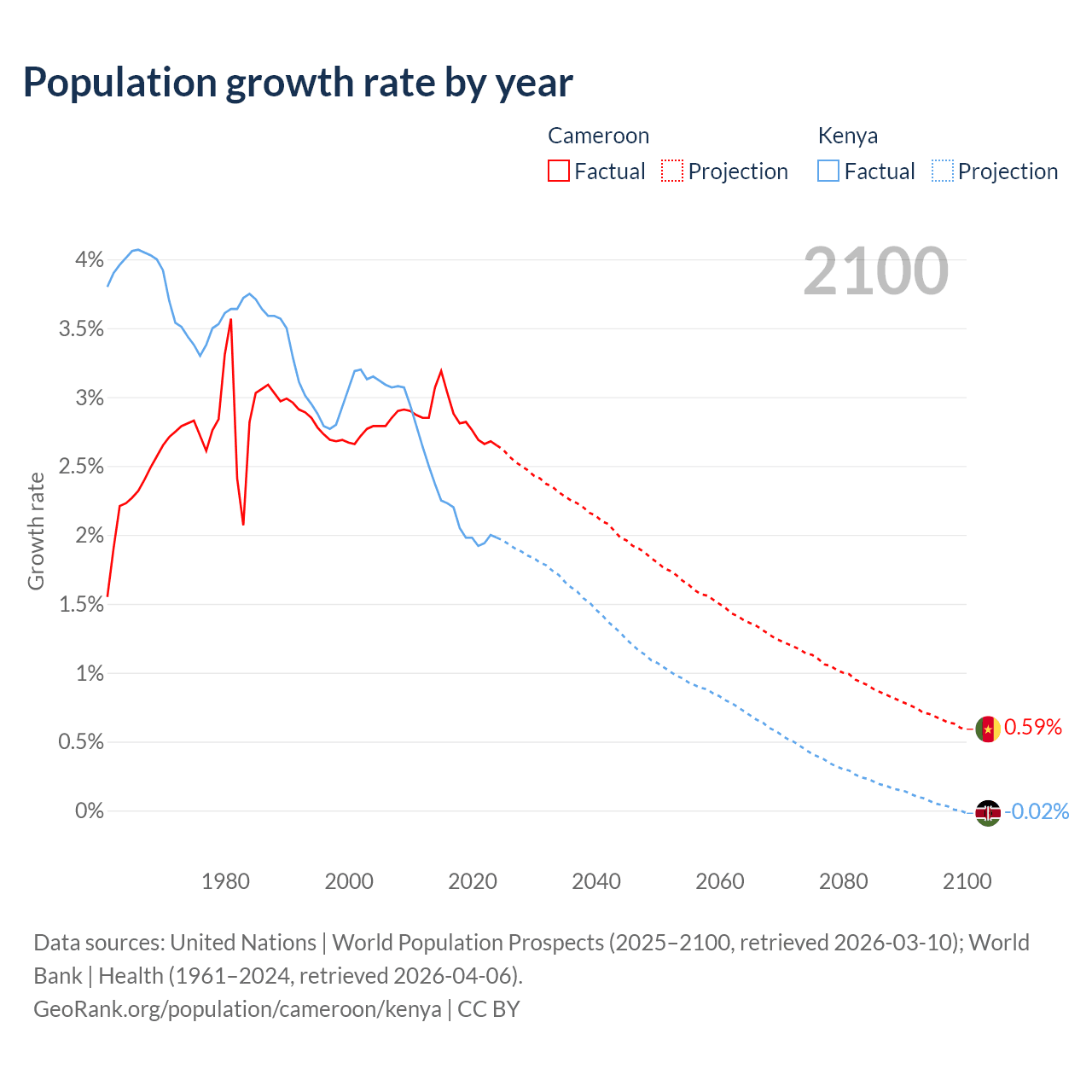 - For the last 10 years, Cameroon has had an average growth rate of +2.84% per year vs +2.08% in Kenya.