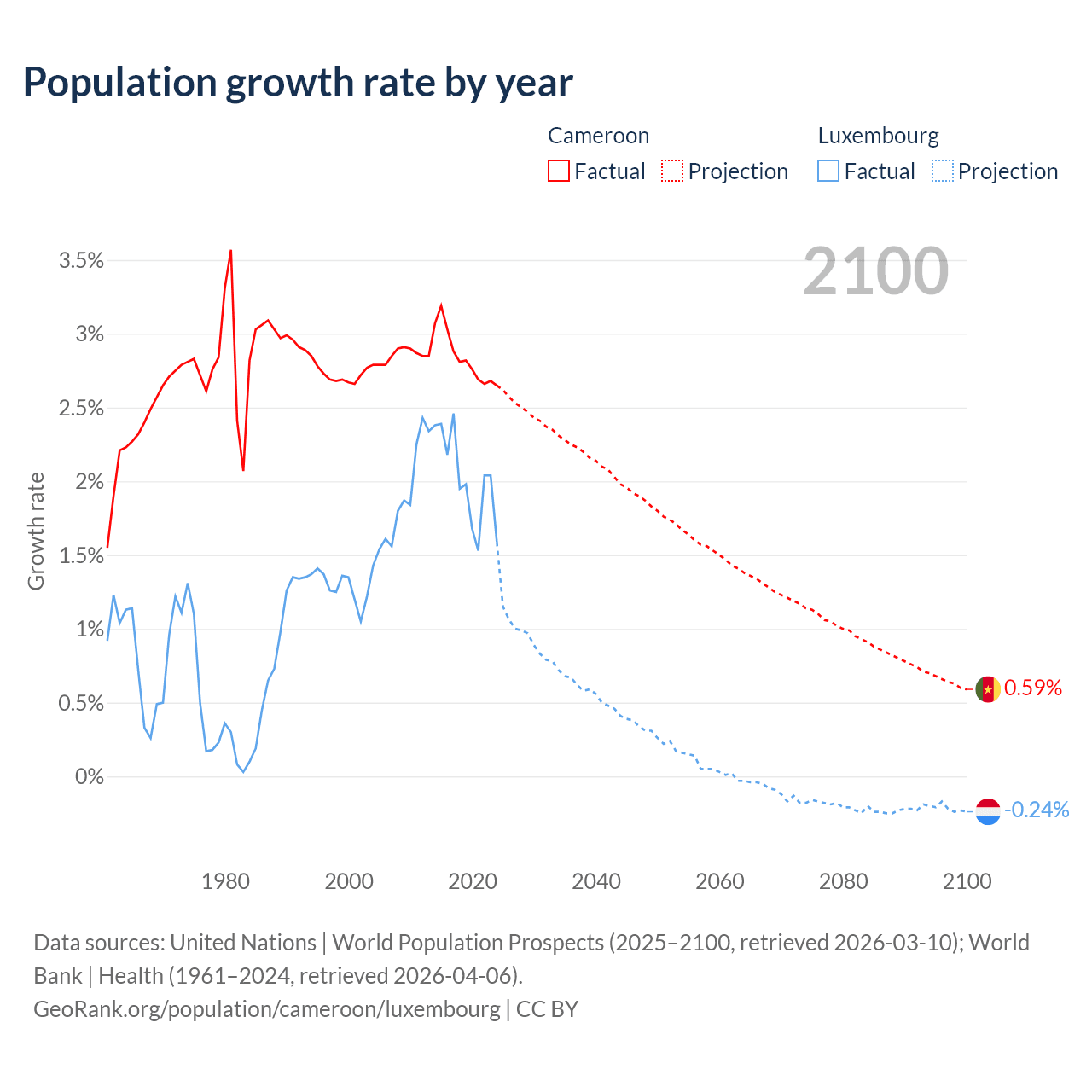 Cameroon vs Luxembourg: population by year and forecast