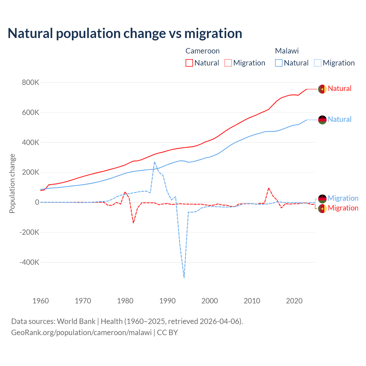 Over the last 10 years, 99.1% of the population change in Cameroon is from natural causes (a gain of 6,982,395 people) and 0.9% is from migration (a gain of 63,139 people). In Malawi 99.3% is from natural causes (a gain of 5,019,393 people) and 0.67% is from migration (a loss of 33,768 people).