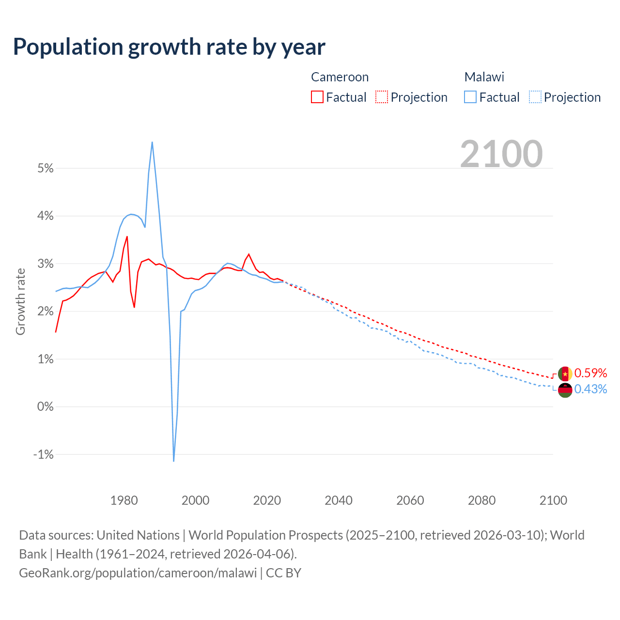 - For the last 10 years, Cameroon has had an average growth rate of +2.84% per year vs +2.7% in Malawi.