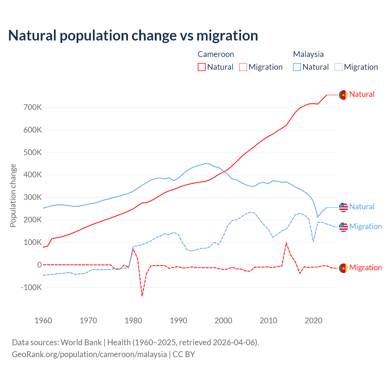 Over the last 10 years, 99.1% of the population change in Cameroon is from natural causes (a gain of 6,982,395 people) and 0.9% is from migration (a gain of 63,139 people). In Malaysia 61.7% is from natural causes (a gain of 3,029,648 people) and 38.3% is from migration (a gain of 1,882,159 people).