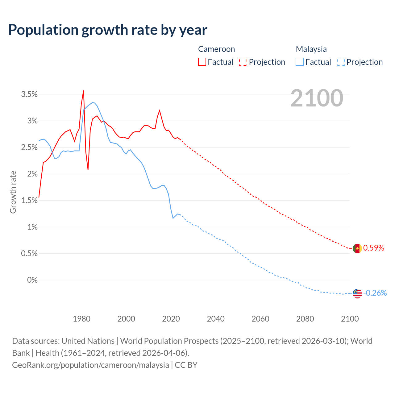 - For the last 10 years, Cameroon has had an average growth rate of +2.84% per year vs +1.5% in Malaysia.