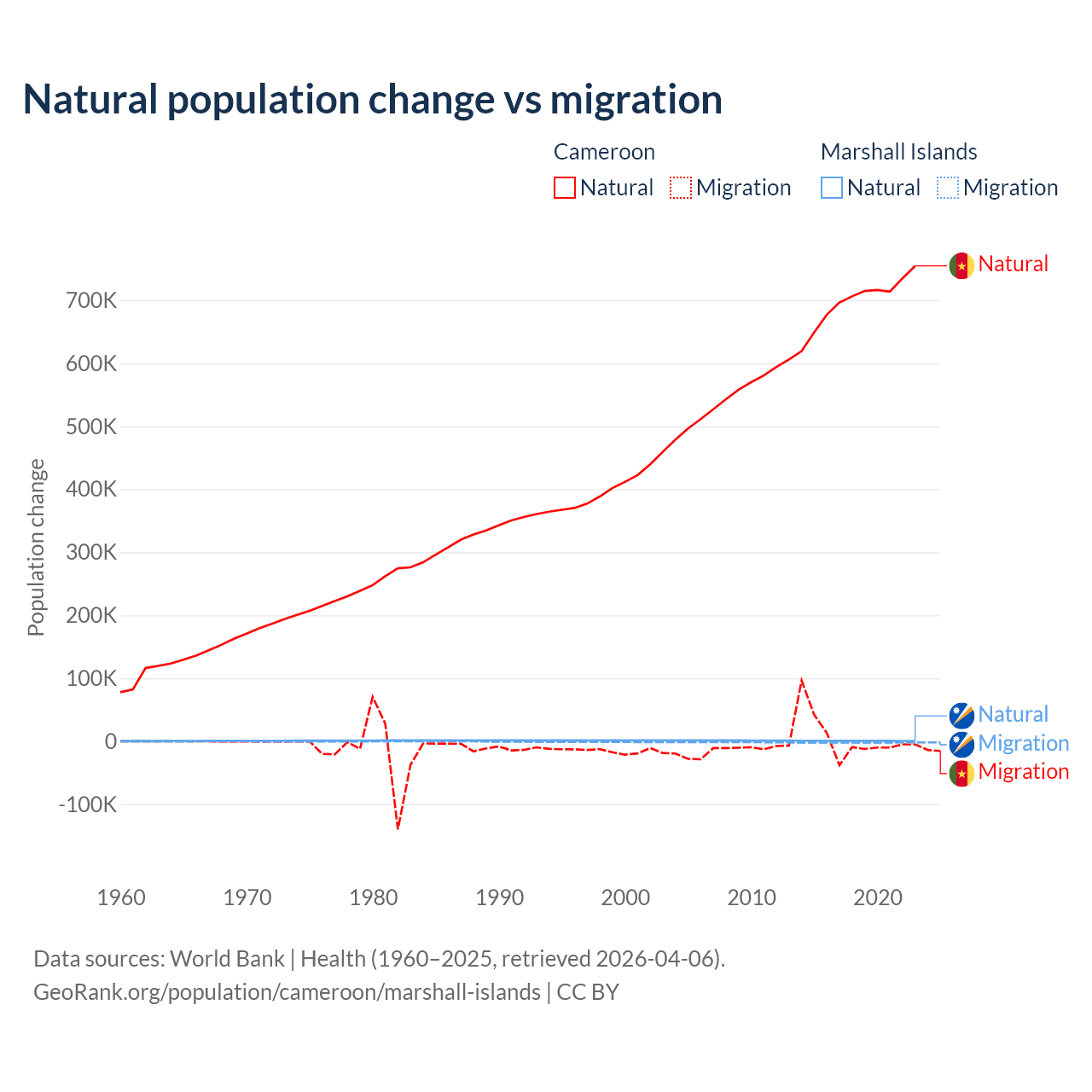 Over the last 10 years, 99.1% of the population change in Cameroon is from natural causes (a gain of 6,982,395 people) and 0.9% is from migration (a gain of 63,139 people). In the Marshall Islands 27.8% is from natural causes (a gain of 7,592 people) and 72.2% is from migration (a loss of 19,682 people).