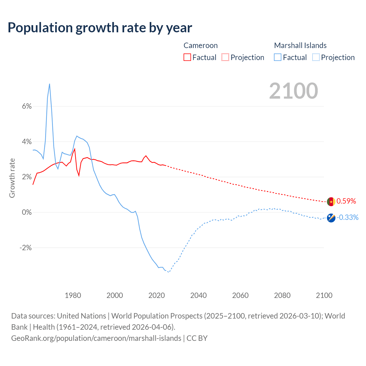 - For the last 10 years, Cameroon has had an average growth rate of +2.84% per year vs -2.69% in the Marshall Islands.