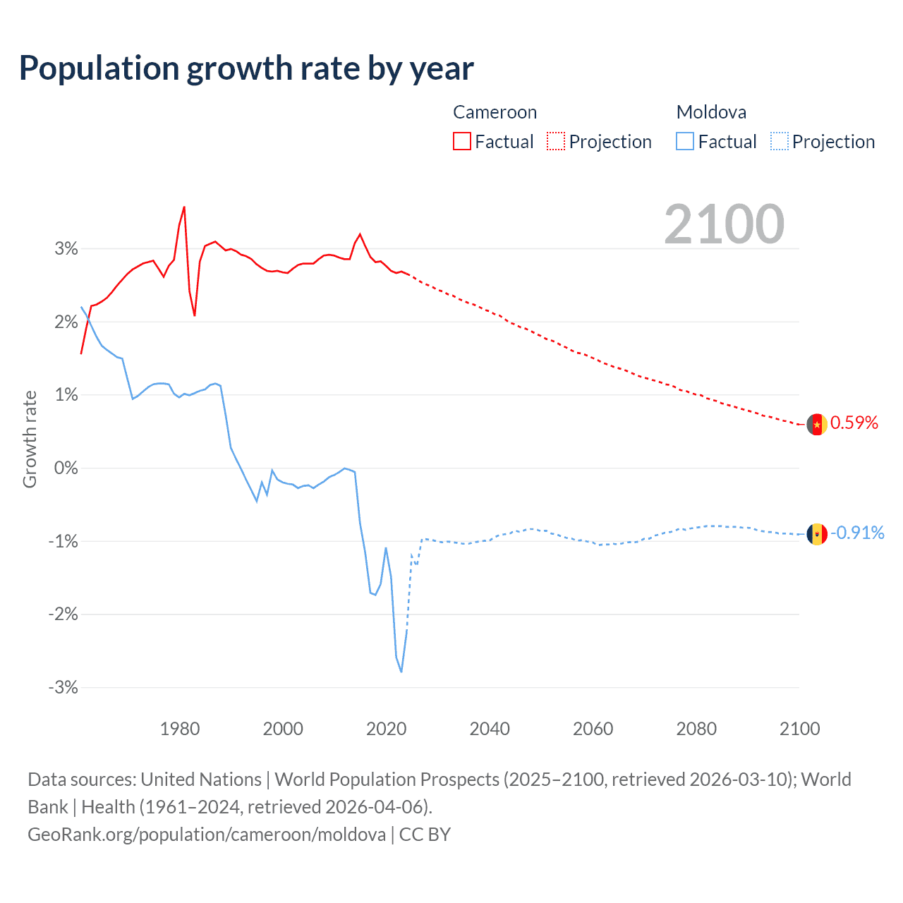 - For the last 10 years, Cameroon has had an average growth rate of +2.84% per year vs -1.57% in Moldova.