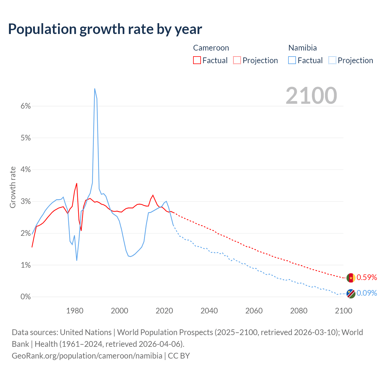 - For the last 10 years, Cameroon has had an average growth rate of +2.84% per year vs +2.73% in Namibia.