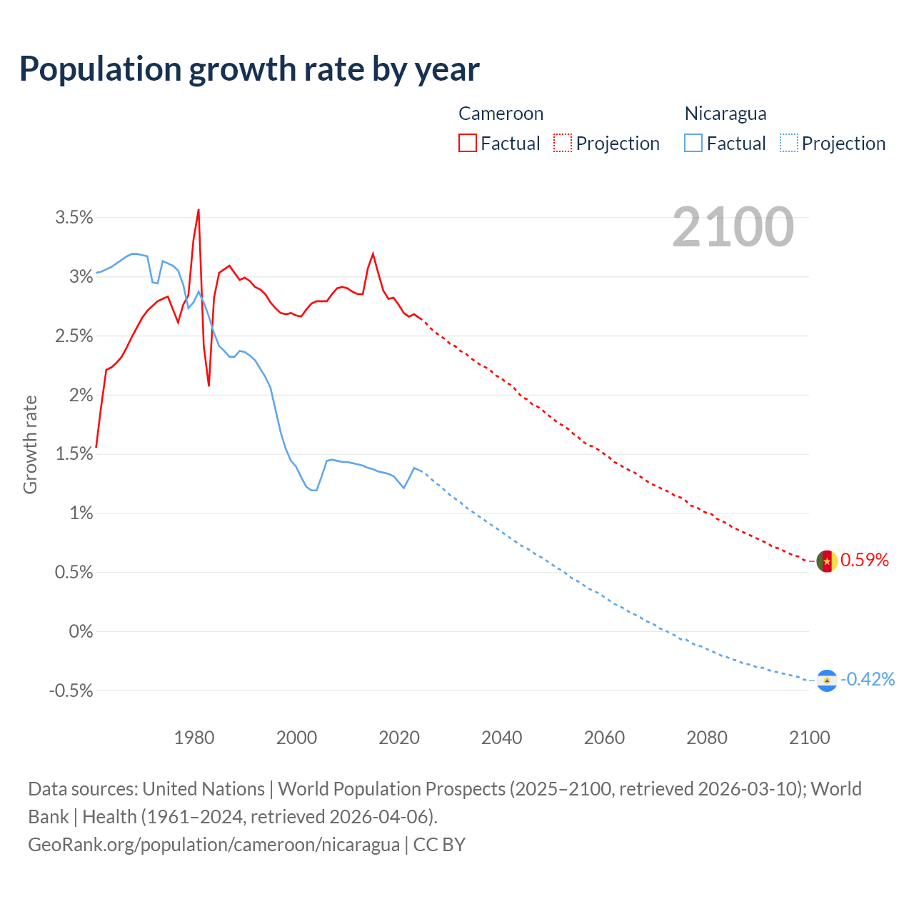 Data sources: World Bank | Health (1960–2024, retrieved 2026-04-06); United Nations | World Population Prospects (1960–2026, retrieved 2026-03-10); U.S. Census Bureau (1960–2025, retrieved 2026-02-08); Central Intelligence Agency (CIA) (2000–2019, retrieved 2026-02-20).