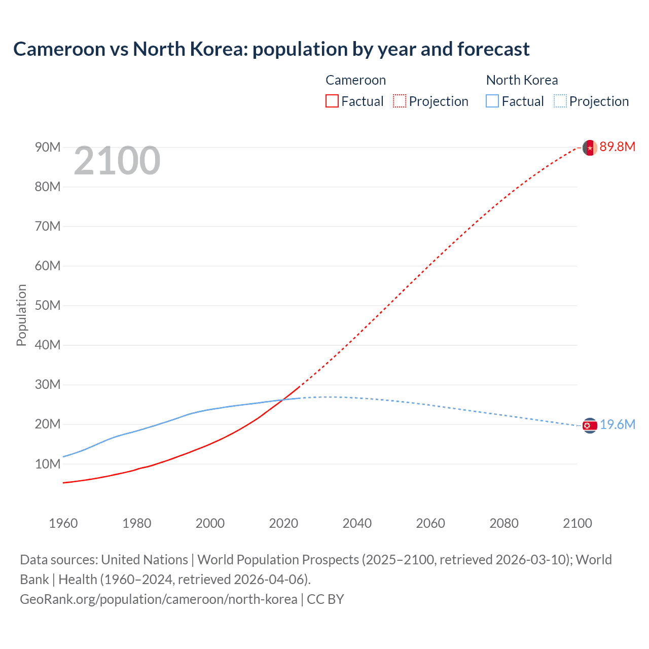 The latest officially reported population of Cameroon was 29,123,744 in 2024 vs 26,498,823 people in North Korea in 2024. In 2026, based on the adjusted UN estimation, the current Cameroon's population is 30,864,115 people compared to 26,659,144 in North Korea.