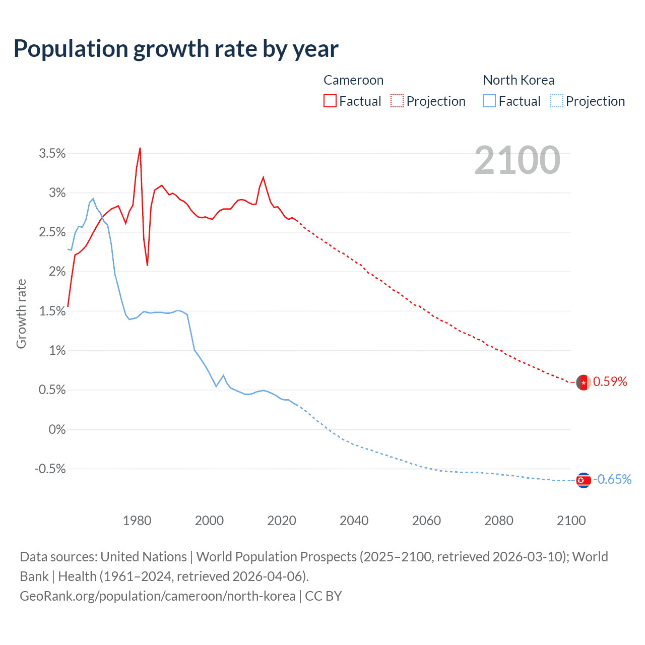 - For the last 10 years, Cameroon has had an average growth rate of +2.84% per year vs +0.41% in North Korea.