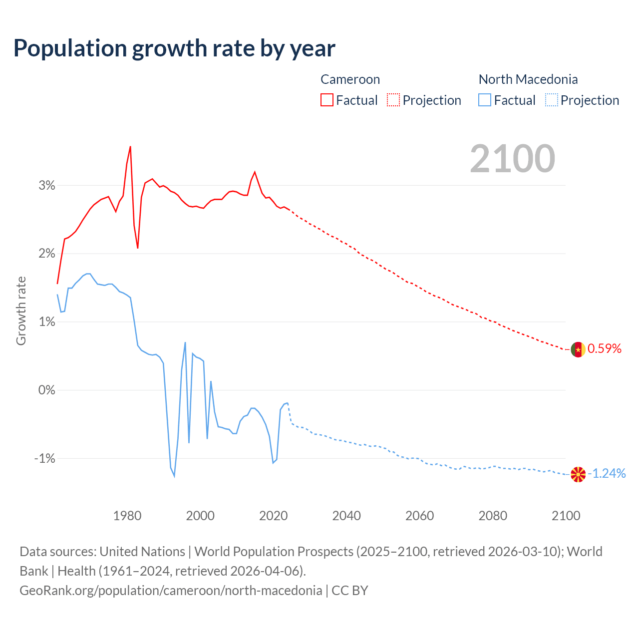 - For the last 10 years, Cameroon has had an average growth rate of +2.84% per year vs -0.48% in North Macedonia.