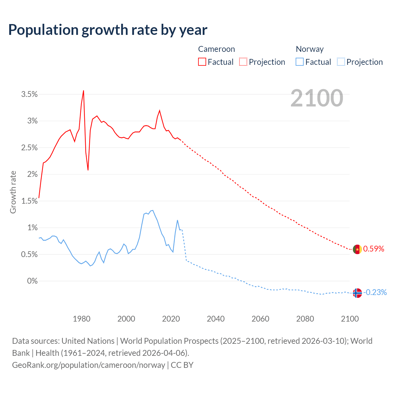- For the last 10 years, Cameroon has had an average growth rate of +2.84% per year vs +0.85% in Norway.