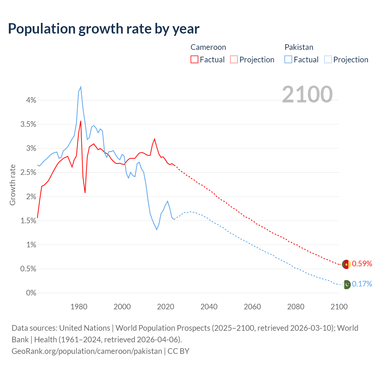 - For the last 10 years, Cameroon has had an average growth rate of +2.84% per year vs +1.6% in Pakistan.
