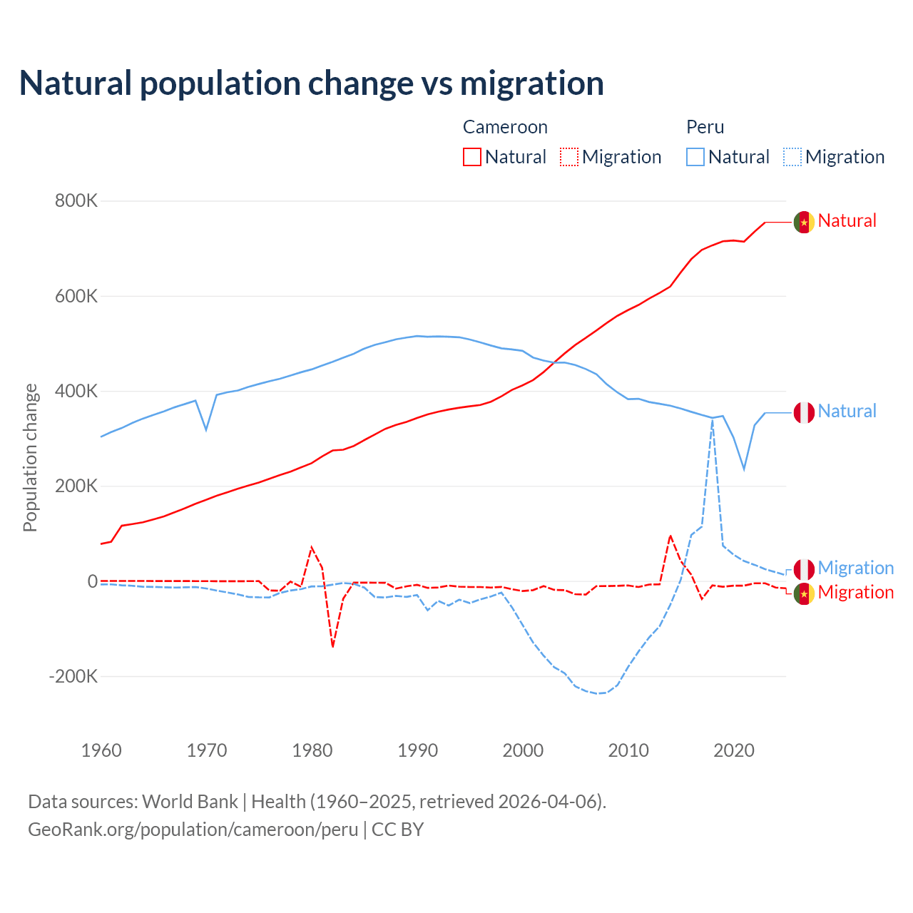 Over the last 10 years, 99.1% of the population change in Cameroon is from natural causes (a gain of 6,982,395 people) and 0.9% is from migration (a gain of 63,139 people). In Peru 82% is from natural causes (a gain of 3,345,822 people) and 18% is from migration (a gain of 732,505 people).