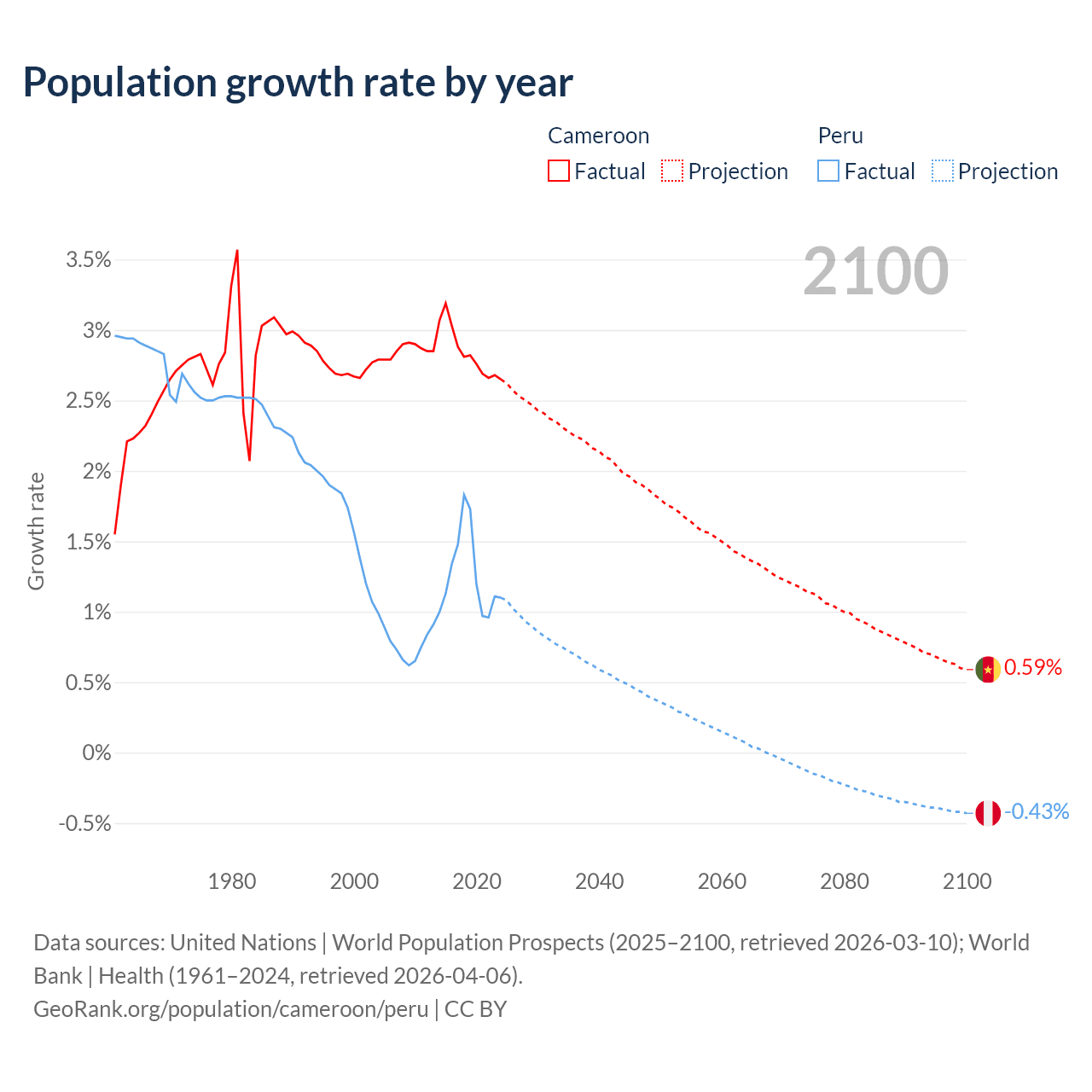 - For the last 10 years, Cameroon has had an average growth rate of +2.84% per year vs +1.26% in Peru.