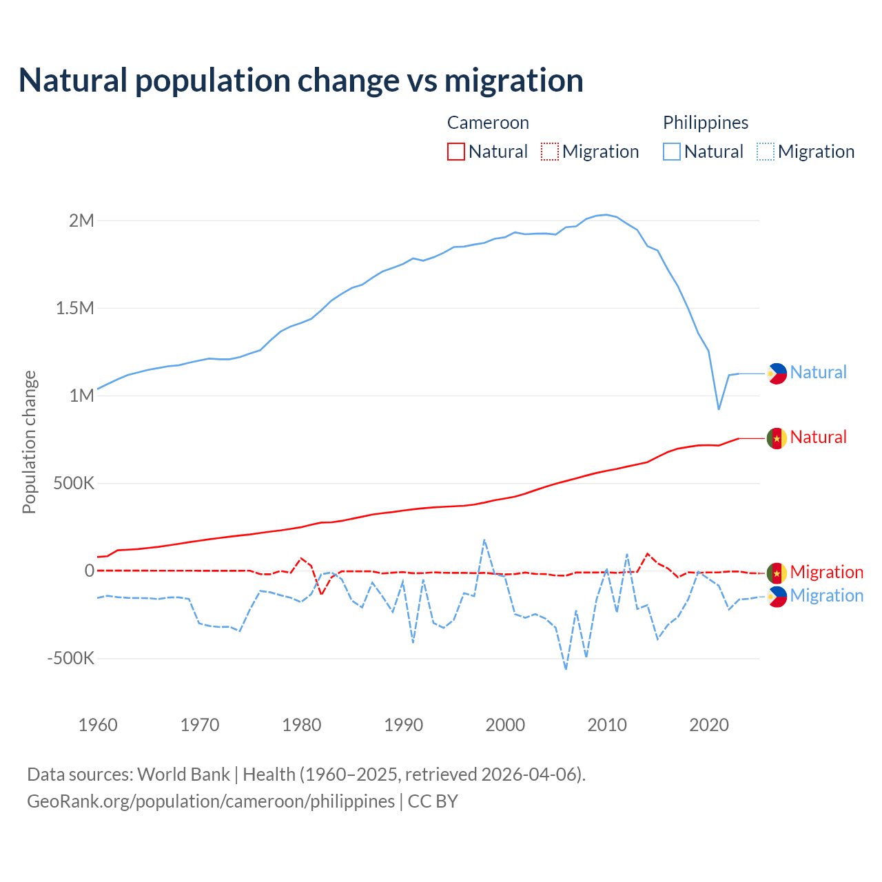 Over the last 10 years, 99.1% of the population change in Cameroon is from natural causes (a gain of 6,982,395 people) and 0.9% is from migration (a gain of 63,139 people). In the Philippines 88.5% is from natural causes (a gain of 14,279,705 people) and 11.5% is from migration (a loss of 1,848,117 people).
