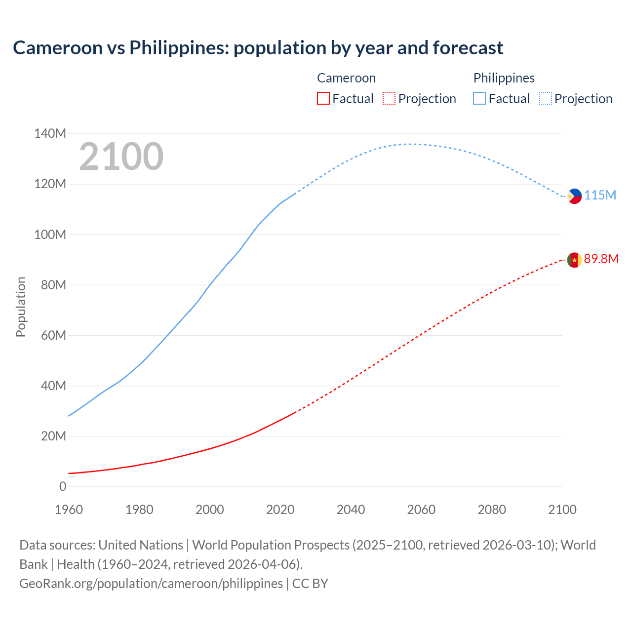 The latest officially reported population of Cameroon was 29,123,744 in 2024 vs 115,843,670 people in the Philippines in 2024. In 2026, based on the adjusted UN estimation, the current Cameroon's population is 30,864,115 people compared to 117,991,570 in the Philippines.