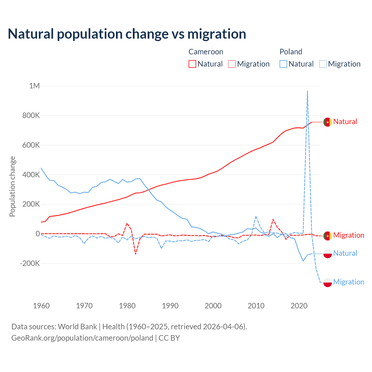 Over the last 10 years, 99.1% of the population change in Cameroon is from natural causes (a gain of 6,982,395 people) and 0.9% is from migration (a gain of 63,139 people). In Poland 41.4% is from natural causes (a loss of 675,443 people) and 58.6% is from migration (a gain of 955,766 people).