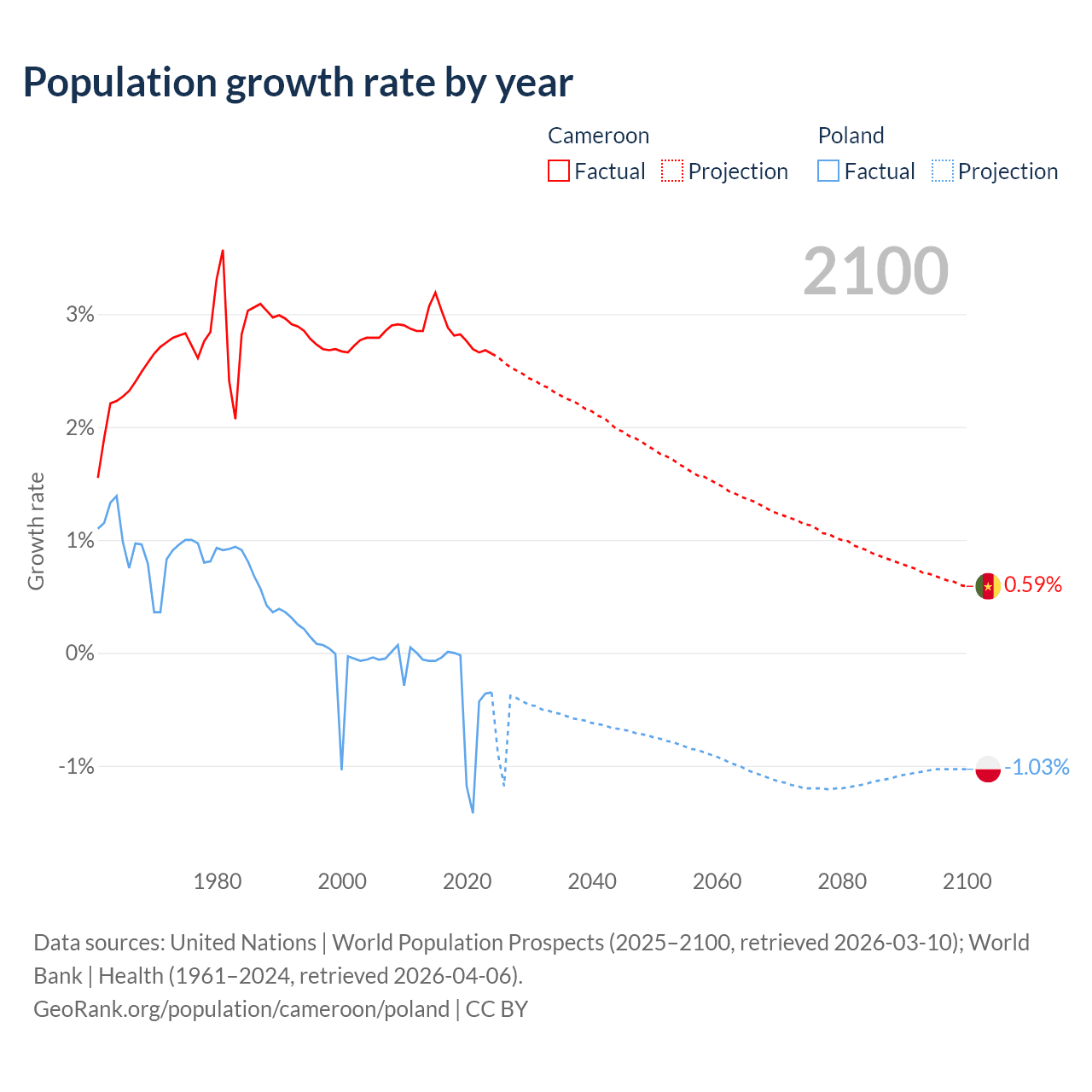 - For the last 10 years, Cameroon has had an average growth rate of +2.84% per year vs -0.36% in Poland.