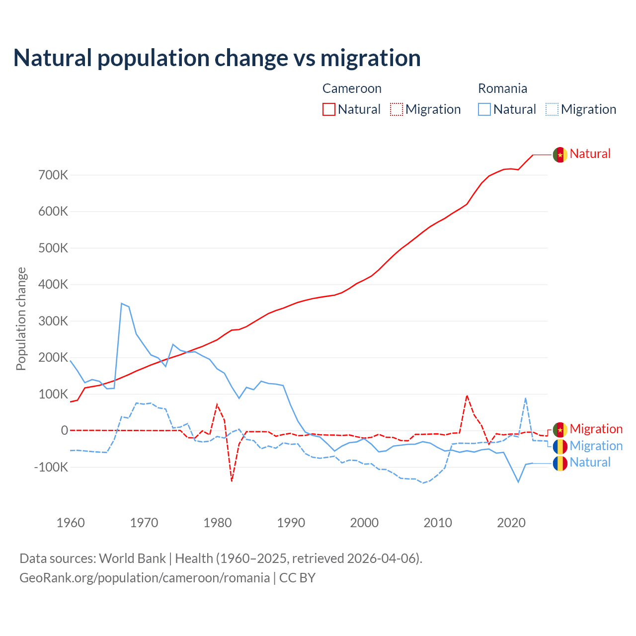 Over the last 10 years, 99.1% of the population change in Cameroon is from natural causes (a gain of 6,982,395 people) and 0.9% is from migration (a gain of 63,139 people). In Romania 82% is from natural causes (a loss of 766,295 people) and 18% is from migration (a loss of 167,917 people).