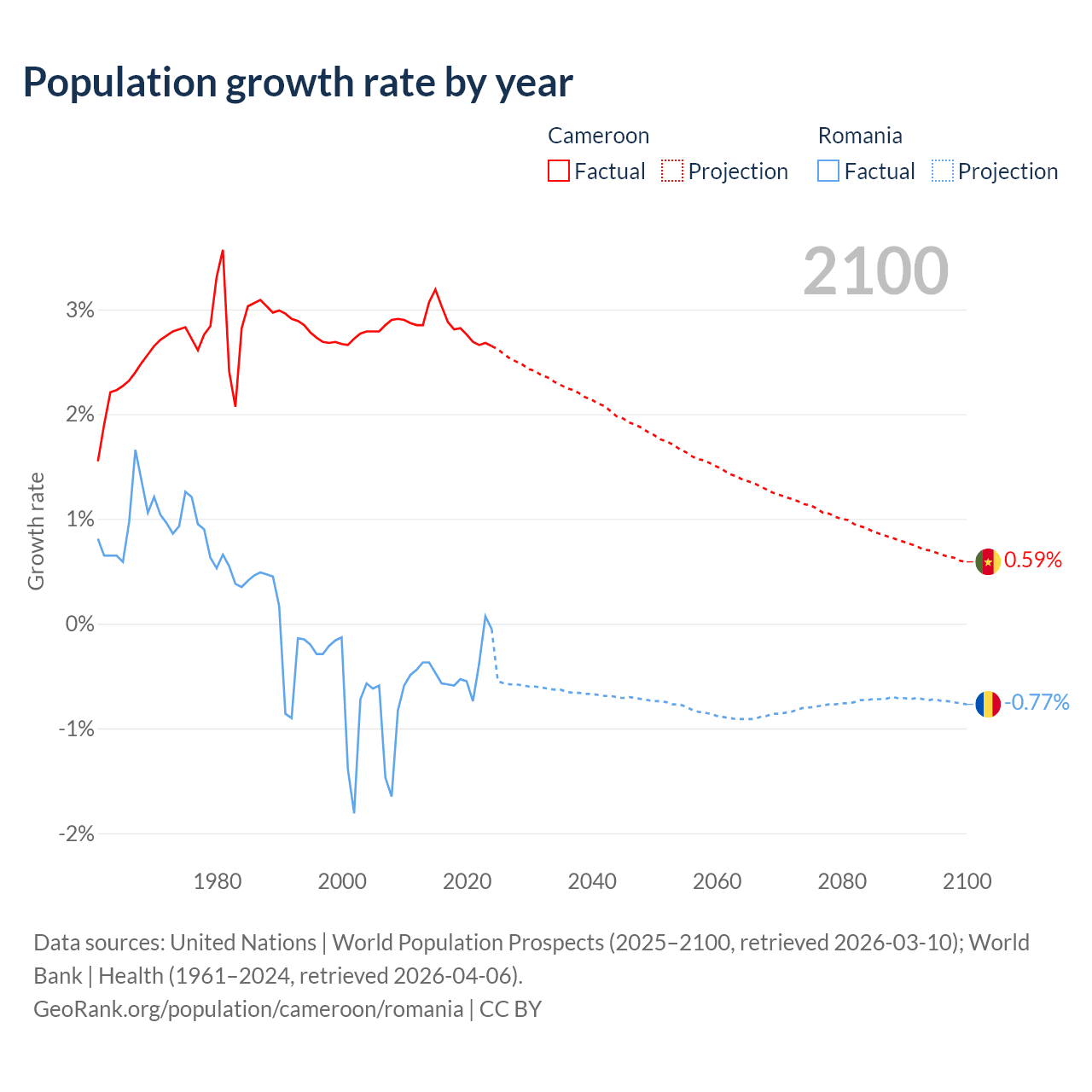 - For the last 10 years, Cameroon has had an average growth rate of +2.84% per year vs -0.43% in Romania.