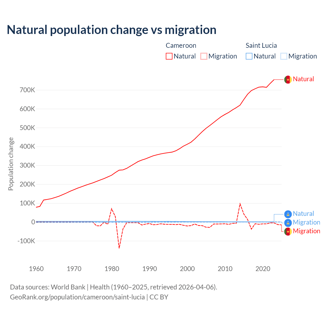 Over the last 10 years, 99.1% of the population change in Cameroon is from natural causes (a gain of 6,982,395 people) and 0.9% is from migration (a gain of 63,139 people). In Saint Lucia 95.7% is from natural causes (a gain of 6,039 people) and 4.31% is from migration (a loss of 272 people).