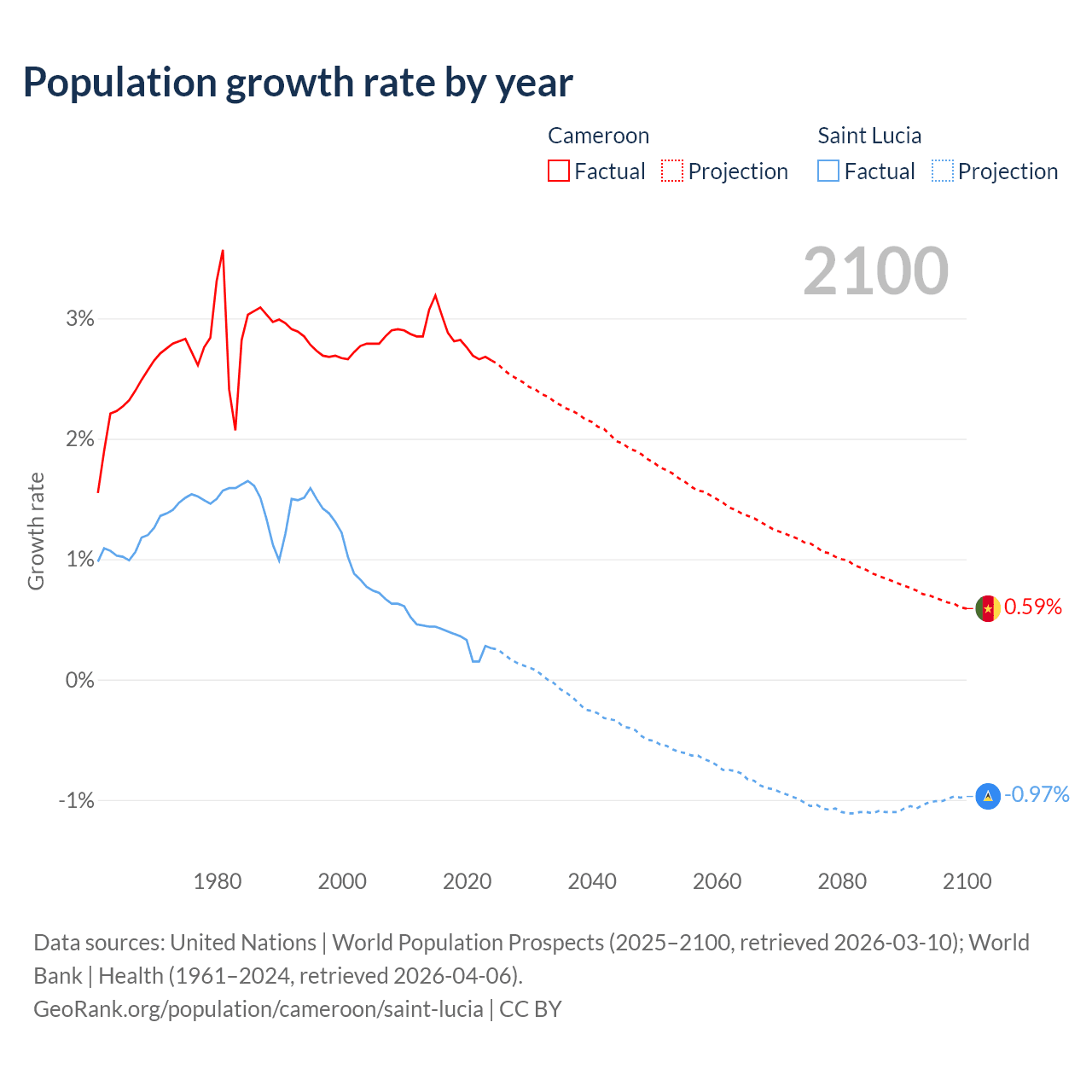 - For the last 10 years, Cameroon has had an average growth rate of +2.84% per year vs +0.33% in Saint Lucia.