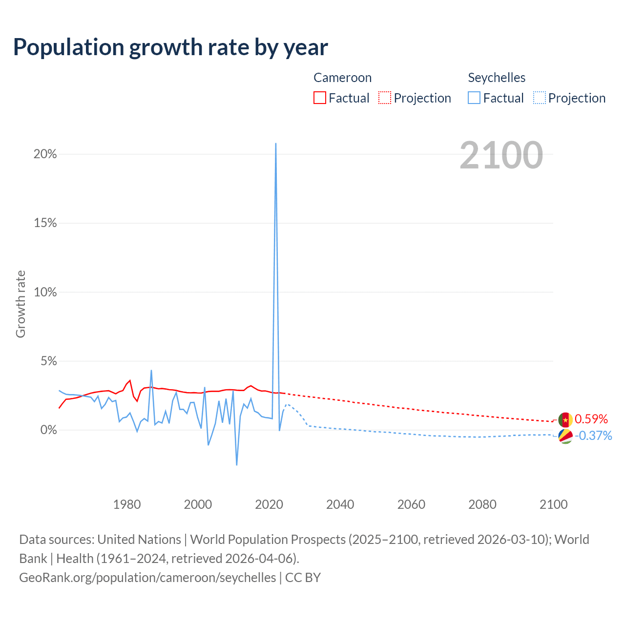- For the last 10 years, Cameroon has had an average growth rate of +2.84% per year vs +2.9% in the Seychelles.