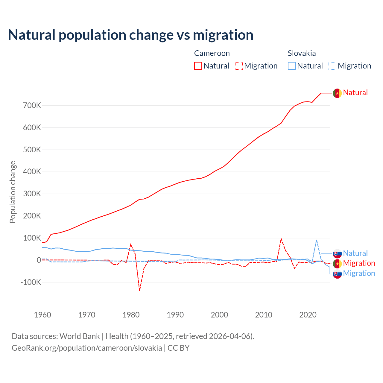 Over the last 10 years, 99.1% of the population change in Cameroon is from natural causes (a gain of 6,982,395 people) and 0.9% is from migration (a gain of 63,139 people). In Slovakia 7.47% is from natural causes (a loss of 8,728 people) and 92.5% is from migration (a gain of 108,156 people).