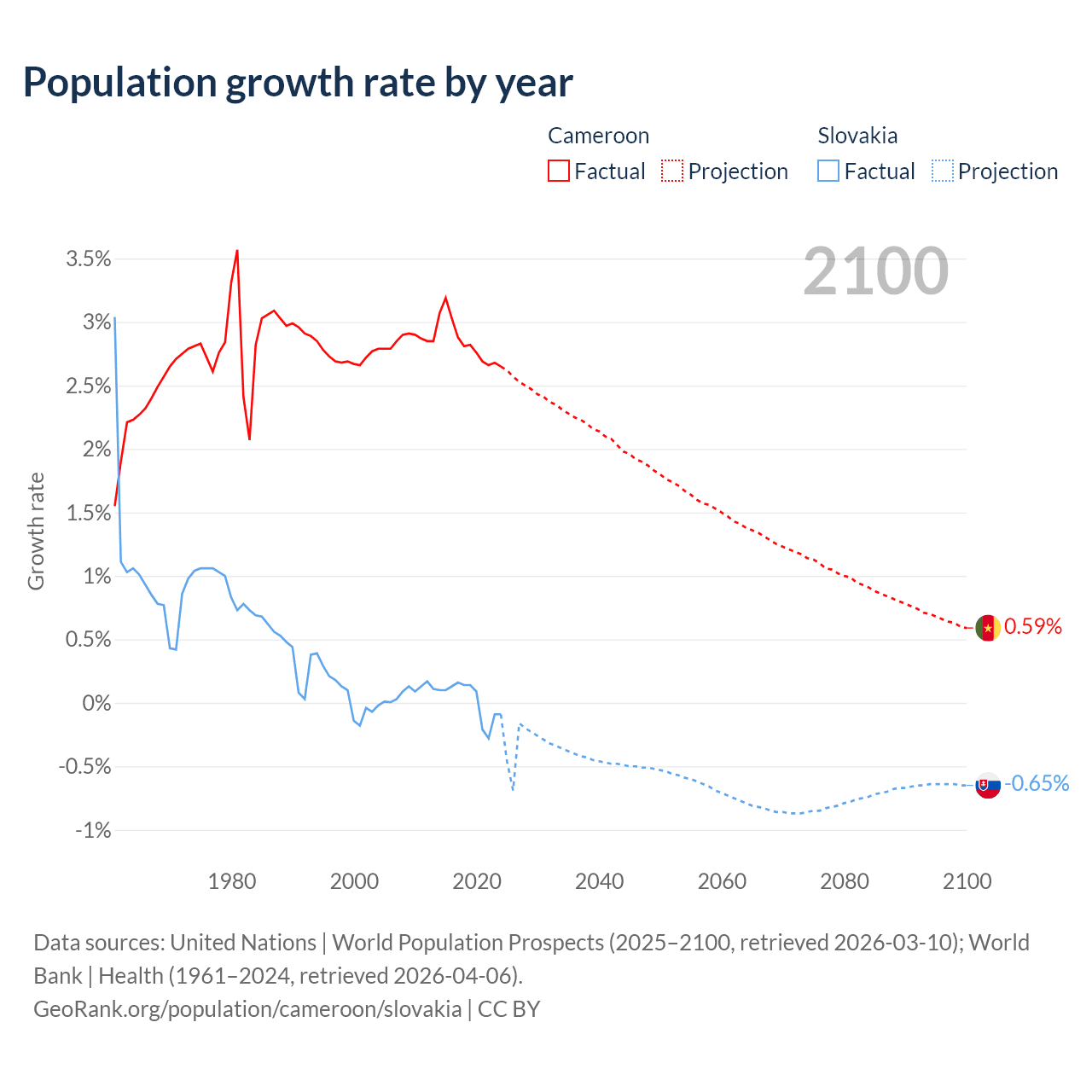 - For the last 10 years, Cameroon has had an average growth rate of +2.84% per year vs +0.01% in Slovakia.