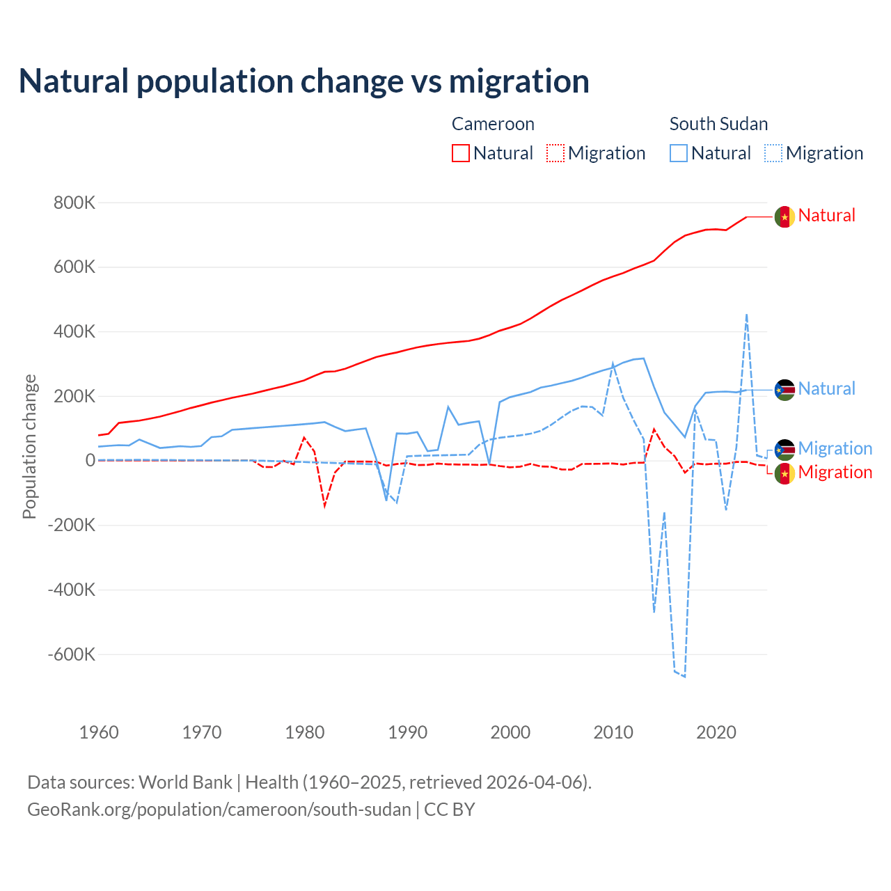 Over the last 10 years, 99.1% of the population change in Cameroon is from natural causes (a gain of 6,982,395 people) and 0.9% is from migration (a gain of 63,139 people). In South Sudan 57.4% is from natural causes (a gain of 1,792,135 people) and 42.6% is from migration (a loss of 1,329,606 people).