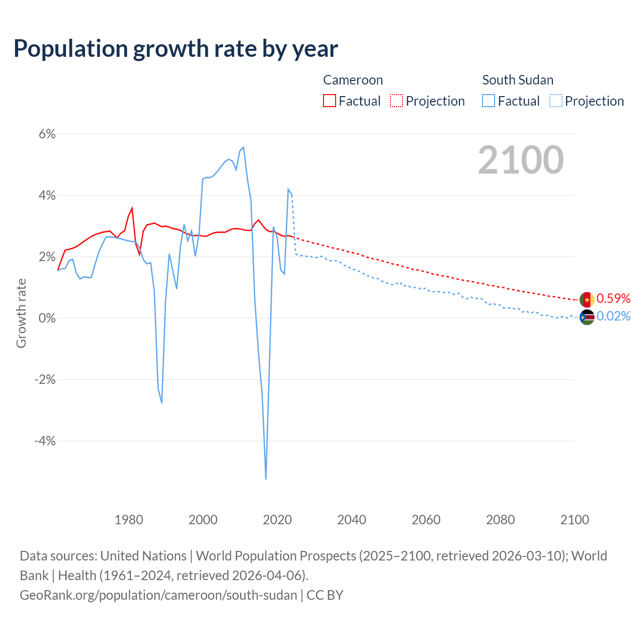 - For the last 10 years, Cameroon has had an average growth rate of +2.84% per year vs +0.65% in South Sudan.