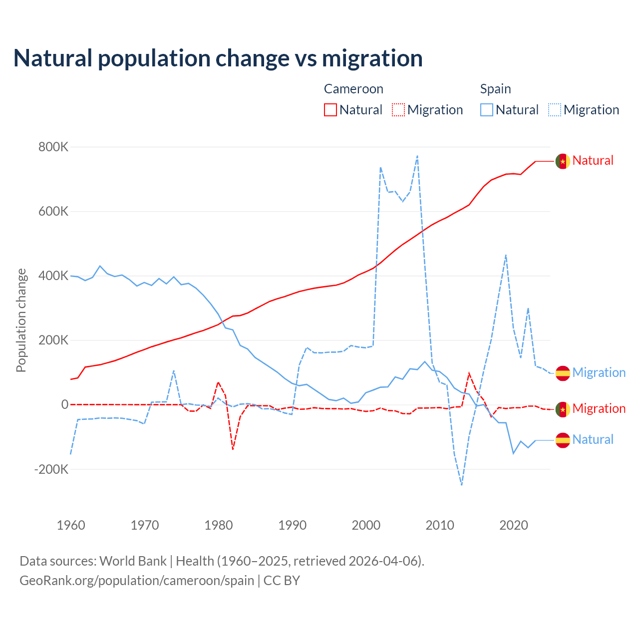 Over the last 10 years, 99.1% of the population change in Cameroon is from natural causes (a gain of 6,982,395 people) and 0.9% is from migration (a gain of 63,139 people). In Spain 25.8% is from natural causes (a loss of 627,829 people) and 74.2% is from migration (a gain of 1,810,127 people).