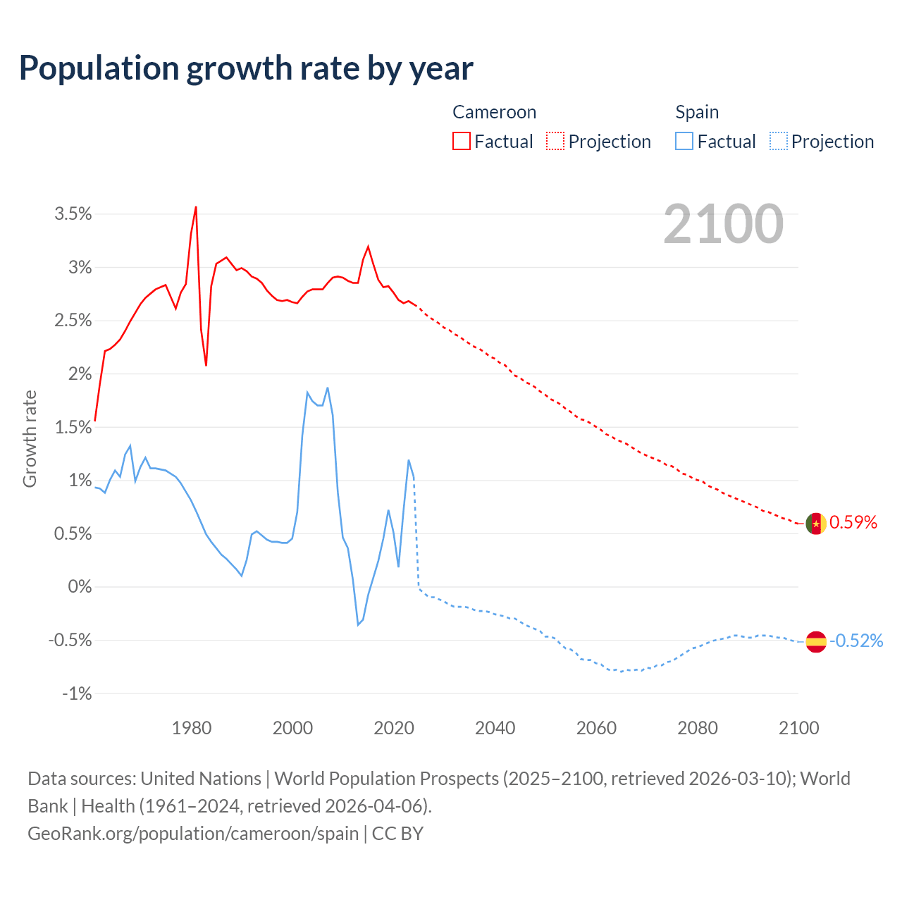 - For the last 10 years, Cameroon has had an average growth rate of +2.84% per year vs +0.43% in Spain.