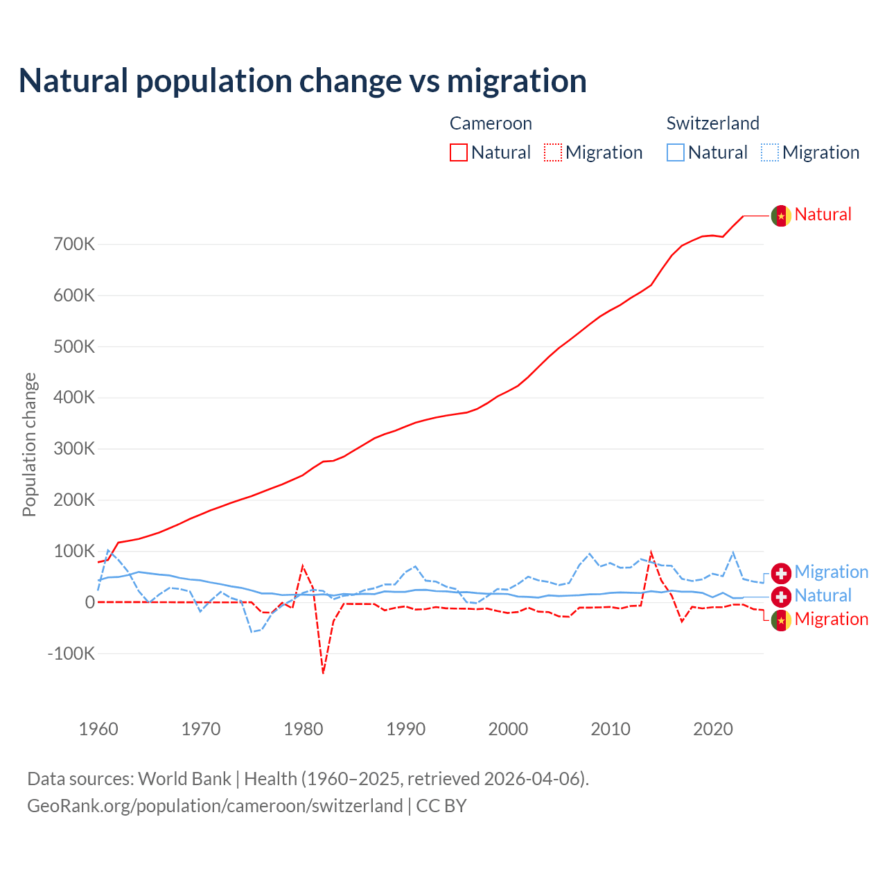 Over the last 10 years, 99.1% of the population change in Cameroon is from natural causes (a gain of 6,982,395 people) and 0.9% is from migration (a gain of 63,139 people). In Switzerland 21.6% is from natural causes (a gain of 165,354 people) and 78.4% is from migration (a gain of 600,145 people).