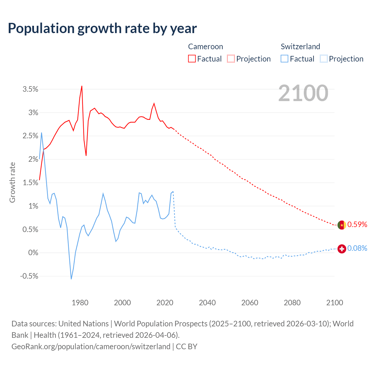 - For the last 10 years, Cameroon has had an average growth rate of +2.84% per year vs +0.98% in Switzerland.