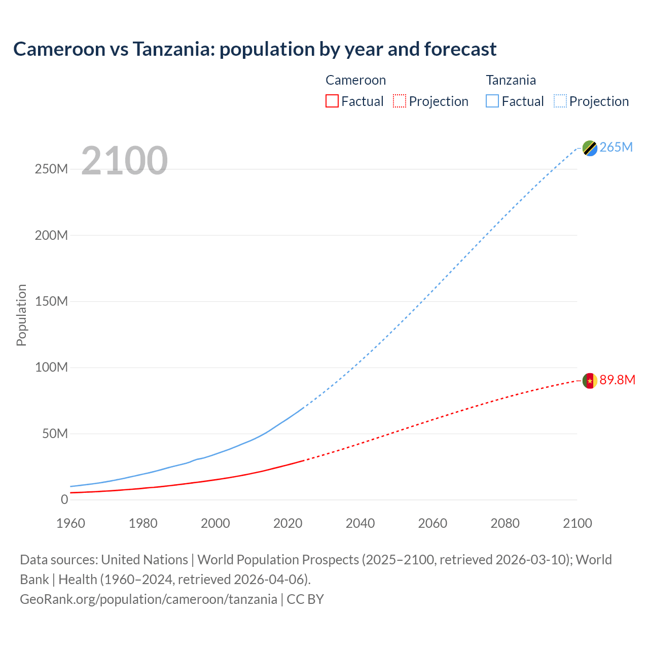 The latest officially reported population of Cameroon was 29,123,744 in 2024 vs 68,560,157 people in Tanzania in 2024. In 2026, based on the adjusted UN estimation, the current Cameroon's population is 30,864,115 people compared to 73,145,892 in Tanzania.
